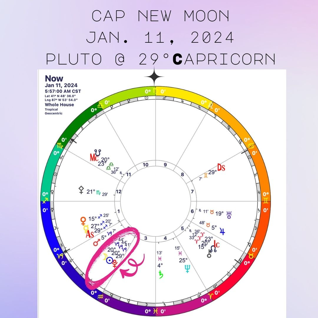 Upon flipping through my ephemeris the next morning, I realized I was right: The New Moon on Thursday, Jan. 11, 2024 (today) is the final Capricorn New Moon in the same sign as Pluto. At least, for the next hundred years or so.