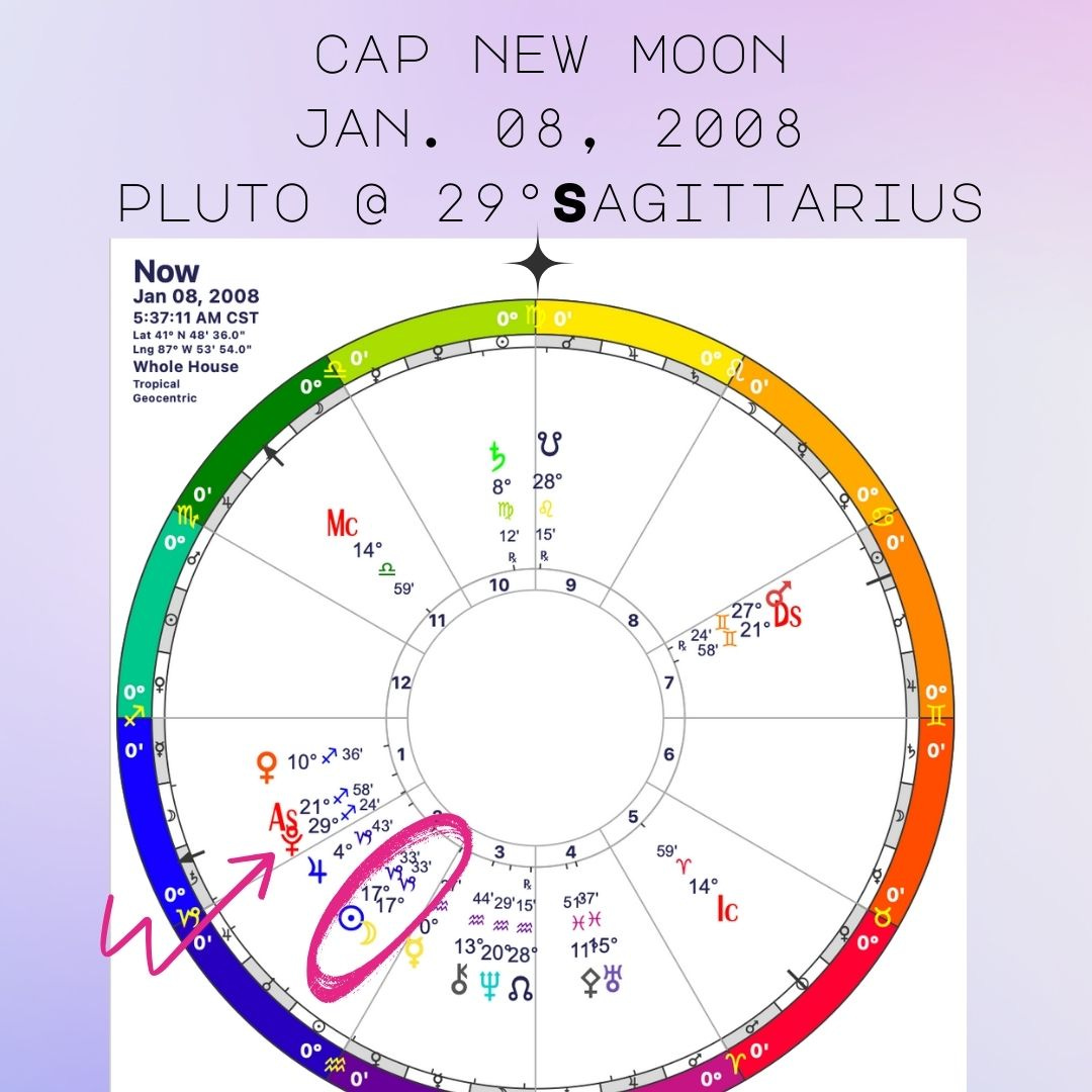 Now, check out today’s New Moon in Capricorn below. It is also co-present with a 29° Pluto, only this time, Pluto is in Capricorn.